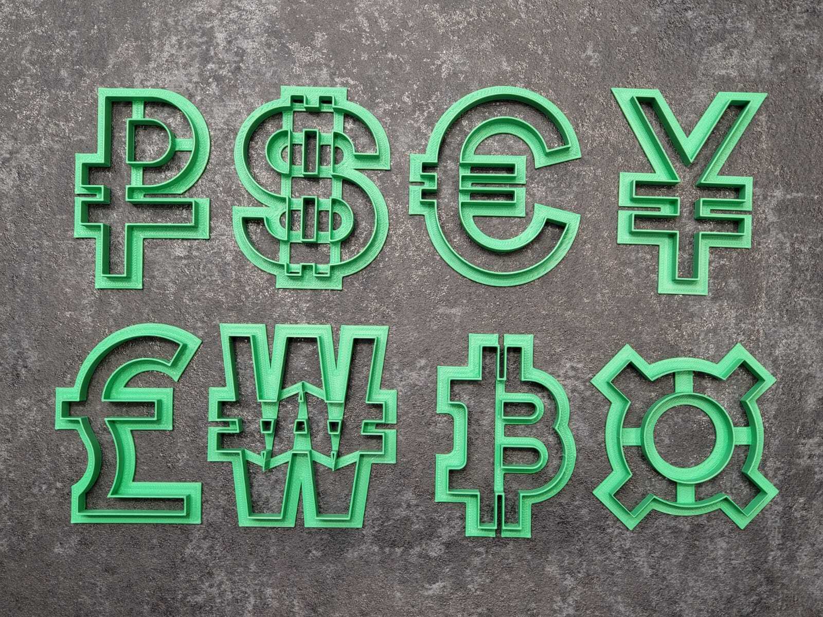 Формы для печенья "Финансы" - комплект (Рубль, Доллар, Евро, Йена, Фунт, Вона, Биткоин, Денежный знак). Используется при изготовлении печенья из теста.