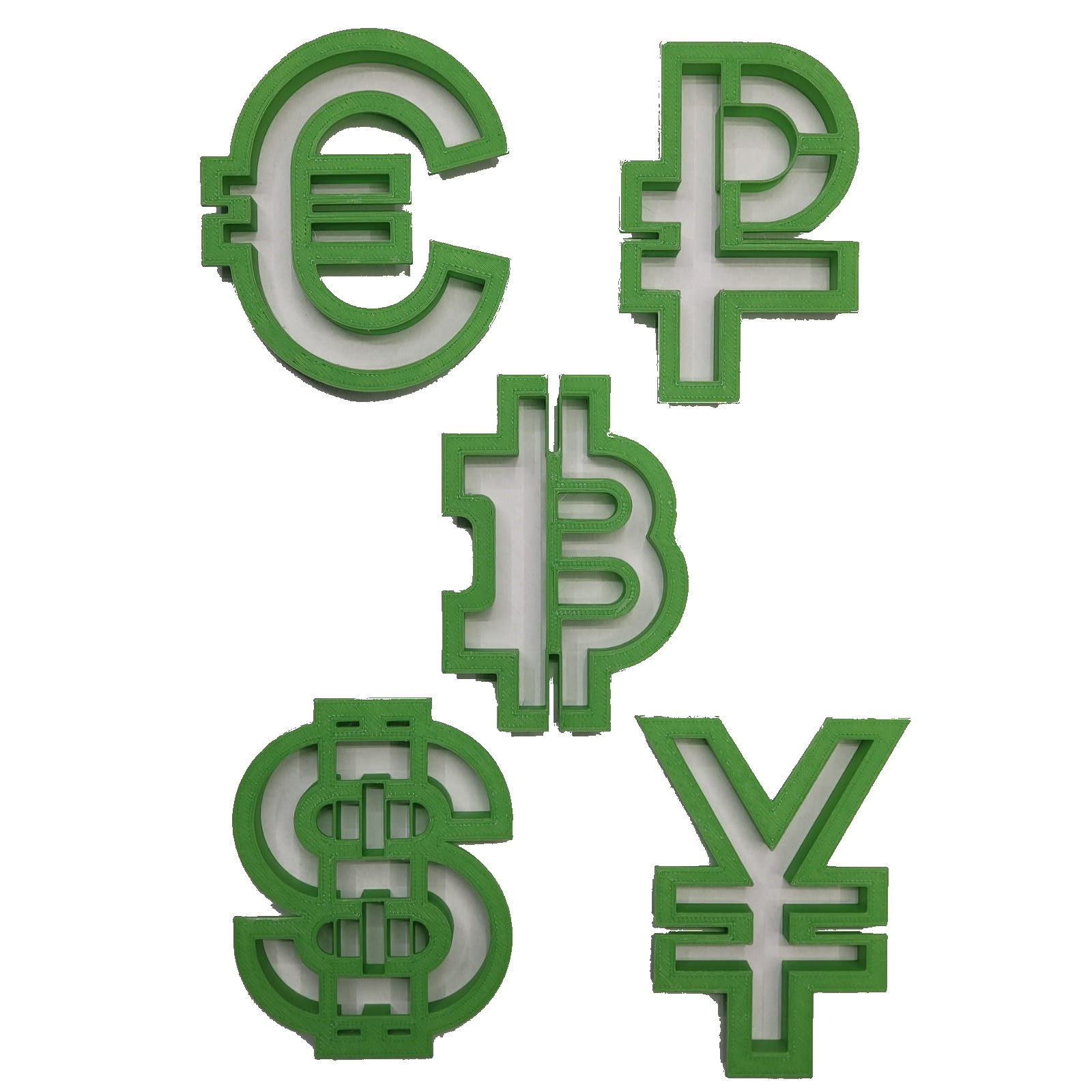 Формы для печенья "Финансы" - комплект (Рубль, Доллар, Евро, Йена, Биткоин). Используется при изготовлении печенья из теста.
